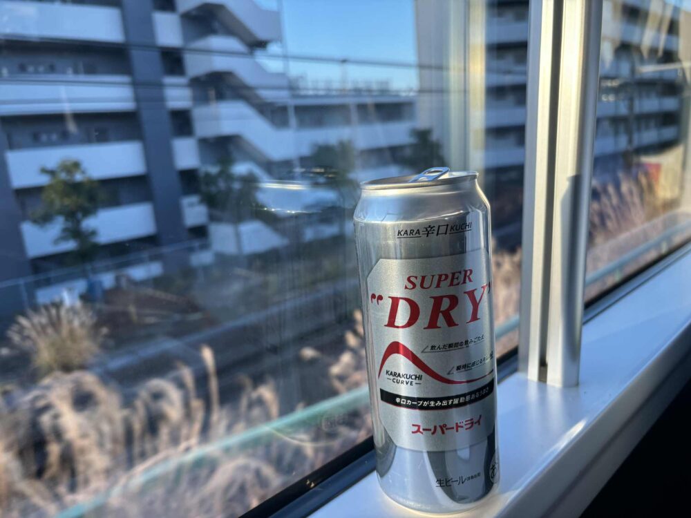 車窓でビールの缶を開けるのであった。